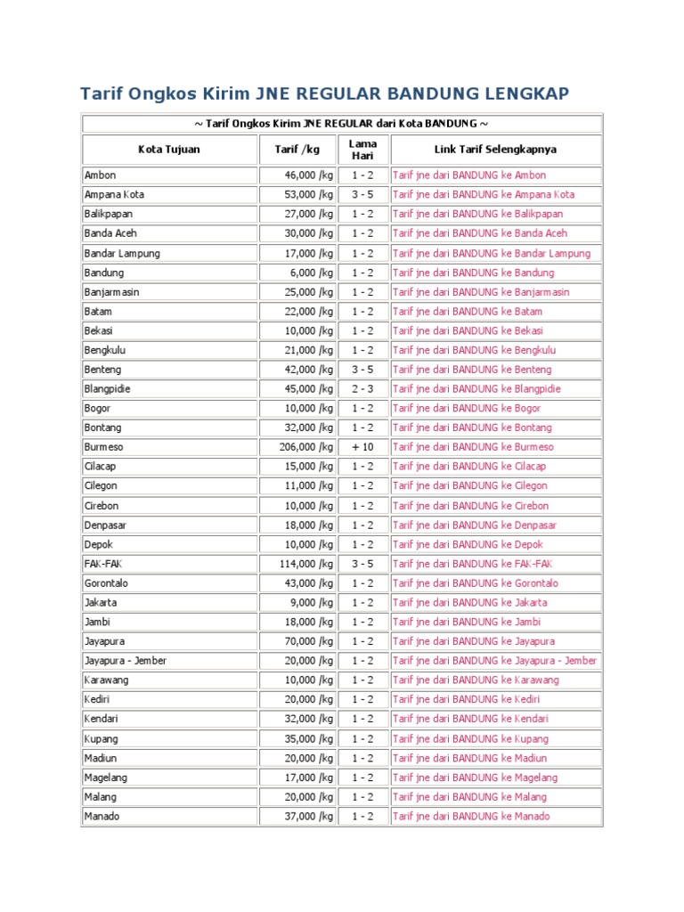 Daftar Tarif Ongkos Kirim Jne Regular Lengkap Dari Bandung Untuk Titipan Kilat Toko Online Anda